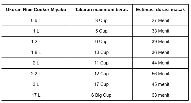 Berikut durasi menanak nasi dengan berbagai macam ukuran Rice Cooker Miyako jika dimasak dalam full kapasitas: