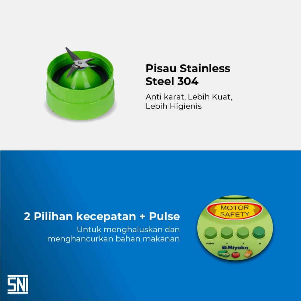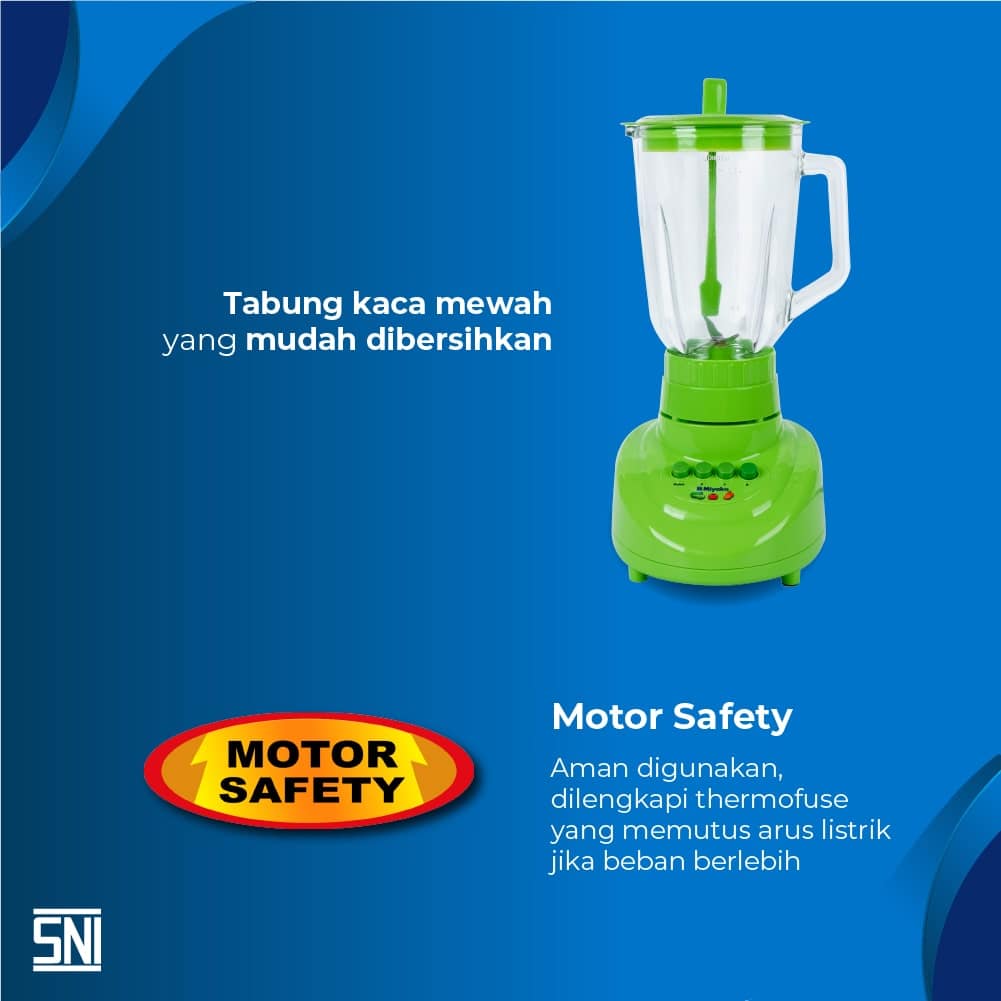 Blender Miyako BL-151 GF ini memiliki 2 pilihan kecepatan serta tombol Pulse yang dapat Anda pilih sesuai kebutuhan. Tombol Pulse berfungsi untuk menyesuaikan tingkat kehalusan jus atau bumbu sesuai yang Anda inginkan. Konsumsi daya sebesar 300 Watt menjadikan BL-151 GF lebih powerful namun tetap hemat listrik. Blender Miyako BL-151 GF juga telah mendapatkan sertifikat SNI sehingga terjamin keamanan dan kualitasnya.