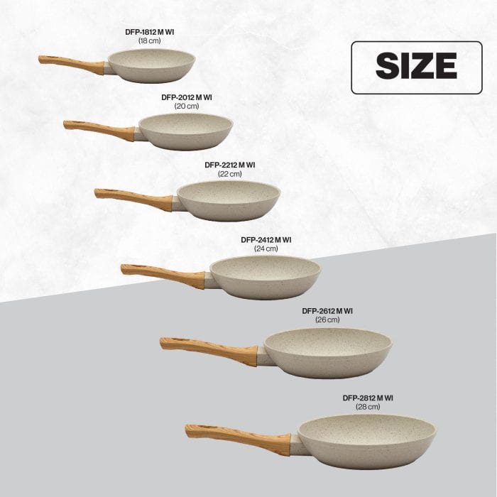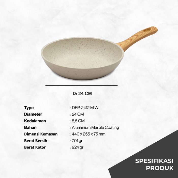 Miyako Cookware DFP-2412 M WI merupakan panci penggorengan Marble Coating berkualitas anti lengket yang mewah dan elegan sehingga mudah dibersihkan. DFP-2412 M WI memiliki diameter sebesar 24 cm dengan kedalaman panci 5.5 cm. Sangat ideal digunakan untuk menumis atau menggoreng berbagai jenis masakan.