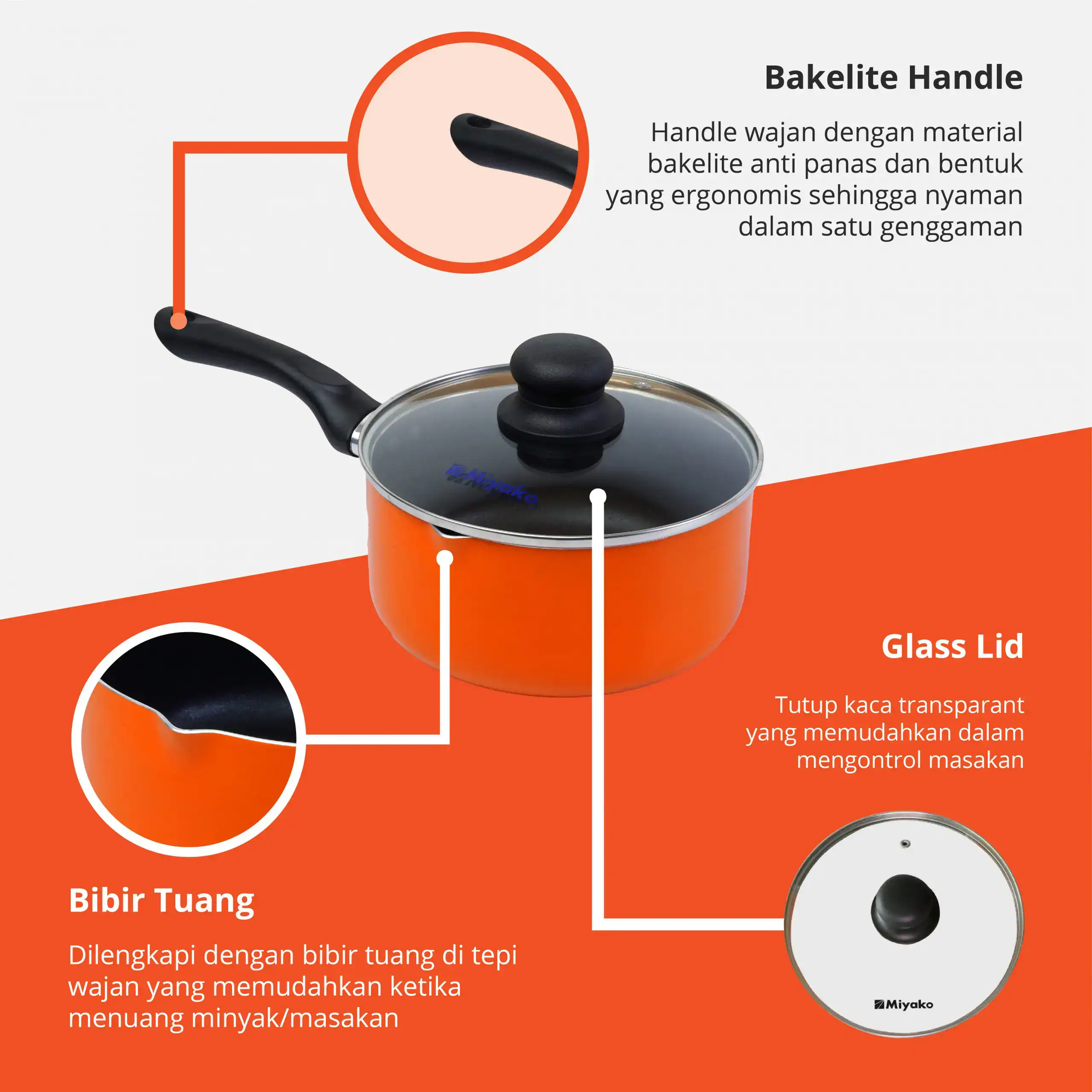 Sauce Pan Miyako merupakan panci memasak berkualitas dengan lapisan anti lengket “Flon+” yang tersedia dalam 2 ukuran yaitu :
