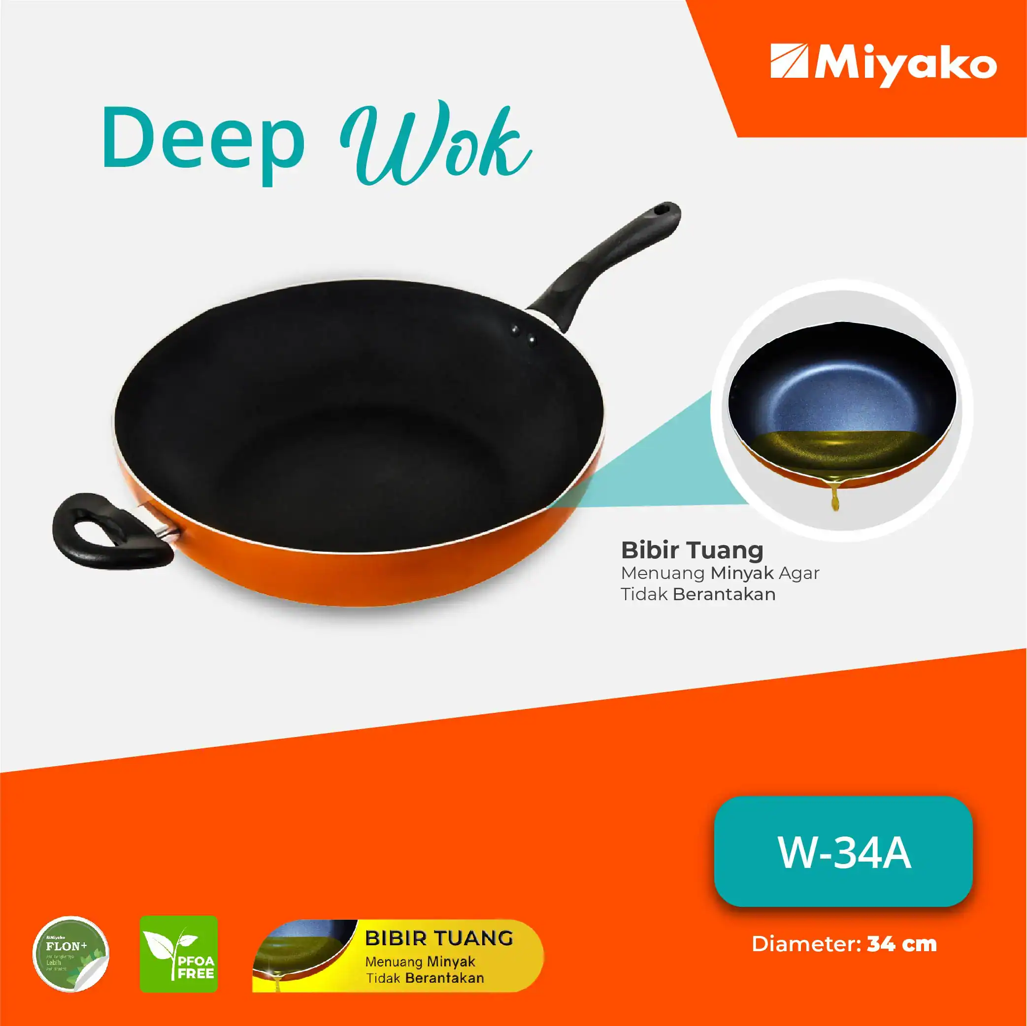 Deep Wok Miyako merupakan panci memasak berkualitas dengan lapisan anti lengket “Flon+” yang tersedia dalam 2 ukuran yaitu :