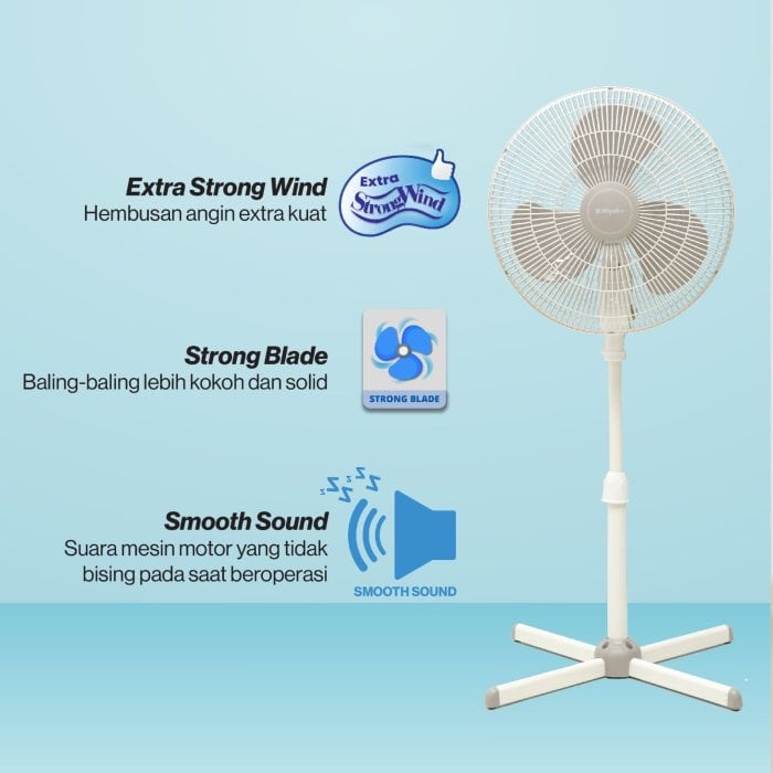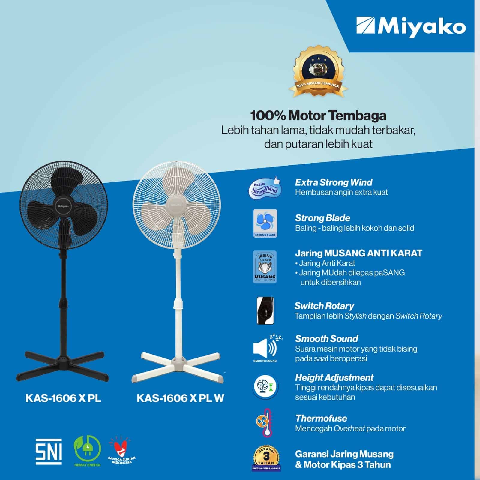 Miyako KAS-1606 X PL merupakan kipas angin berdiri (Stand Fan) berukuran 16 inch. Dilengkapi Motor Kipas 100% Tembaga yang berpadu dengan baling – baling berbahan solid dan kokoh (Strong Blade), sehingga KAS-1606 X PL dapat menghasilkan angin ekstra kencang (Extra Strong Wind) namun tetap hening dan tidak bising saat beroperasi (Smooth Sound).