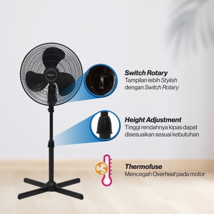 KAS-1606 X PL telah memenuhi standar SNI karena memiliki beragam fitur terbaik. Salah satu pelengkap terbaiknya adalah fitur Thermofuse yaitu fitur keamanan yang dapat memutuskan arus listrik jika motor kipas mengalami overheat. Kipas Angin Miyako juga memberikan garansi selama 3 tahun untuk Jaring Anti Karat dan Motor Kipas.