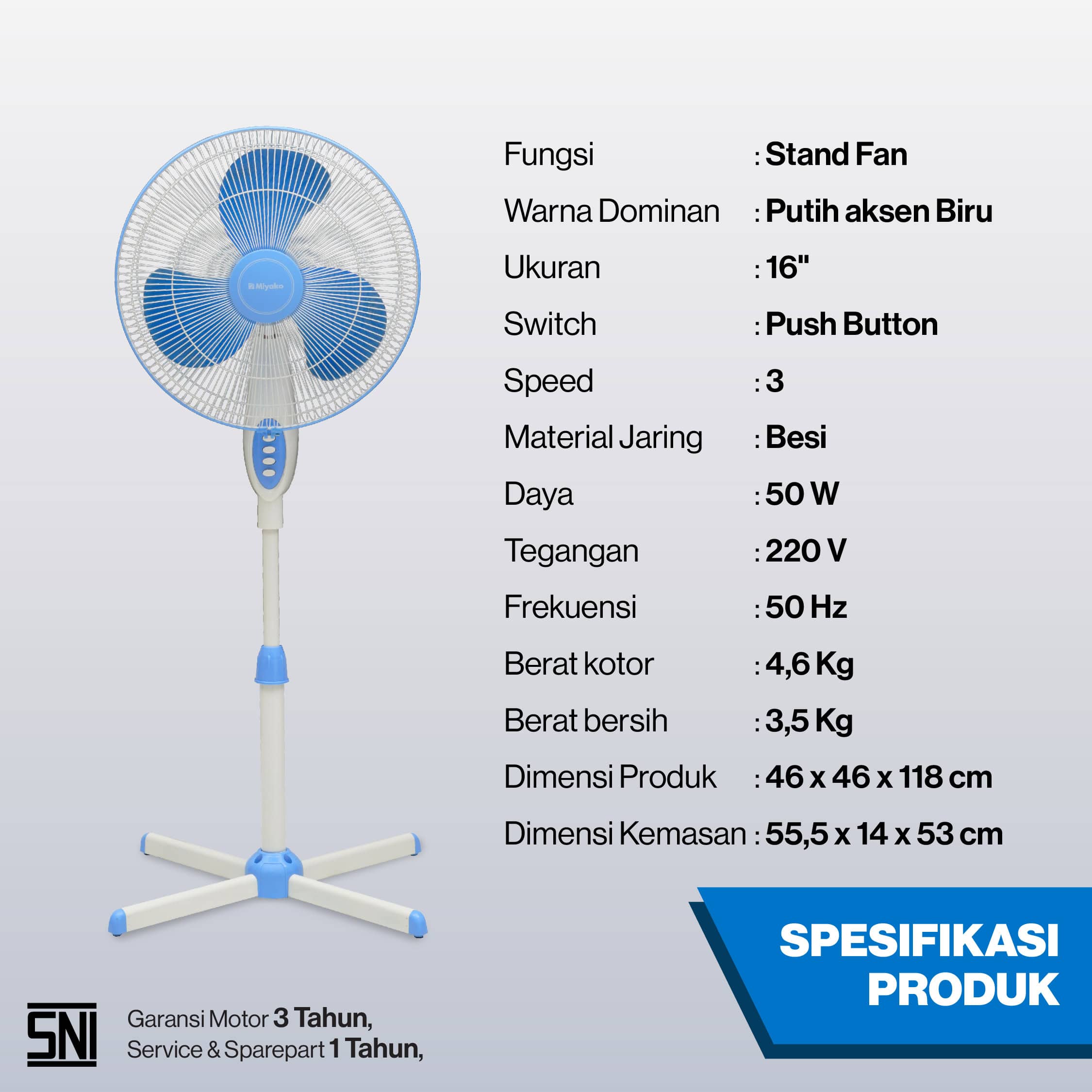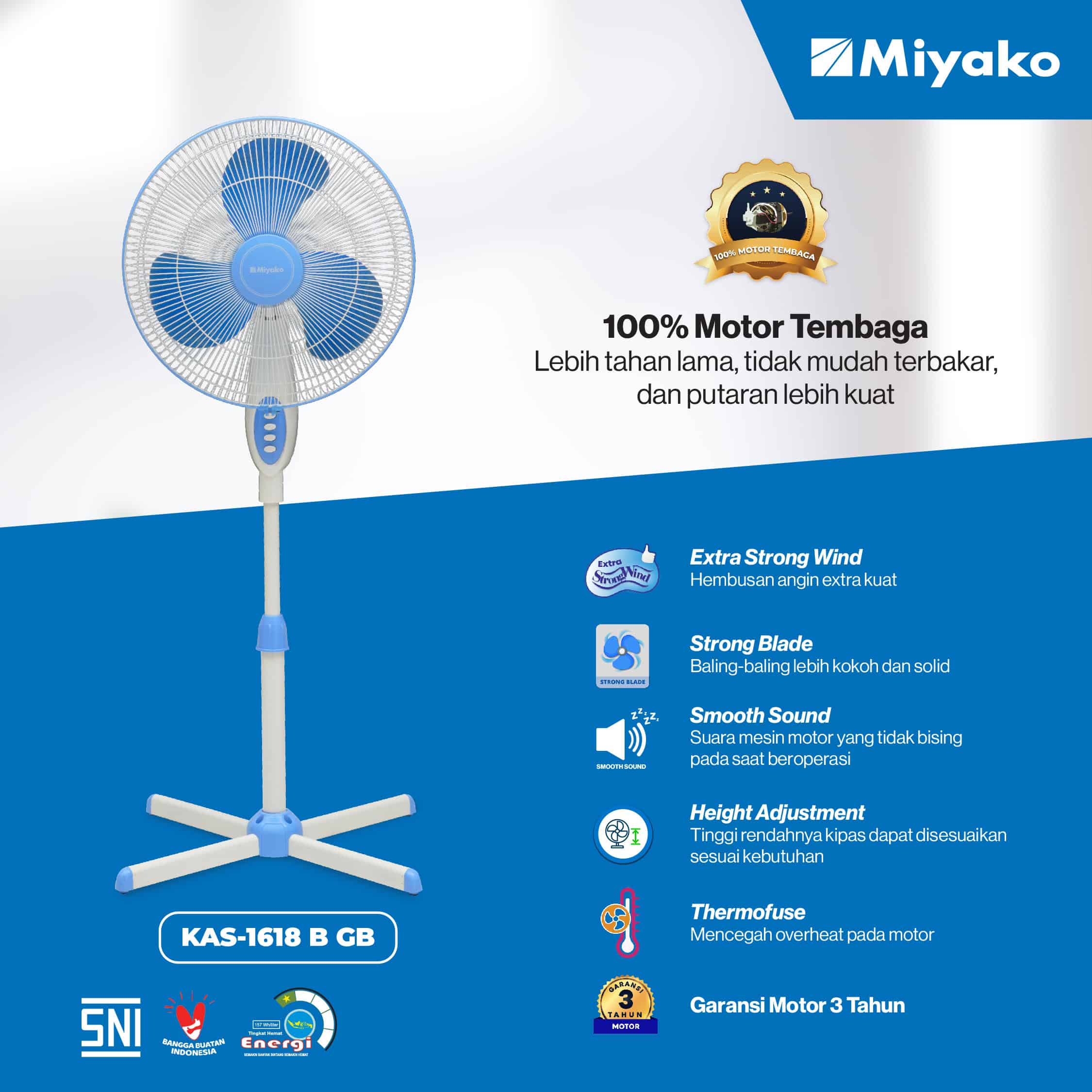 KAS-1618 B GB telah memenuhi standar SNI karena memiliki beragam fitur terbaik. Salah satu pelengkap terbaiknya adalah fitur Thermofuse yaitu fitur keamanan yang dapat memutuskan arus listrik jika motor kipas mengalami overheat. Kipas Angin Miyako juga telah mendapatkan Sertifikat Hemat Energi (SHE) dan garansi selama 3 tahun untuk Motor Kipas.