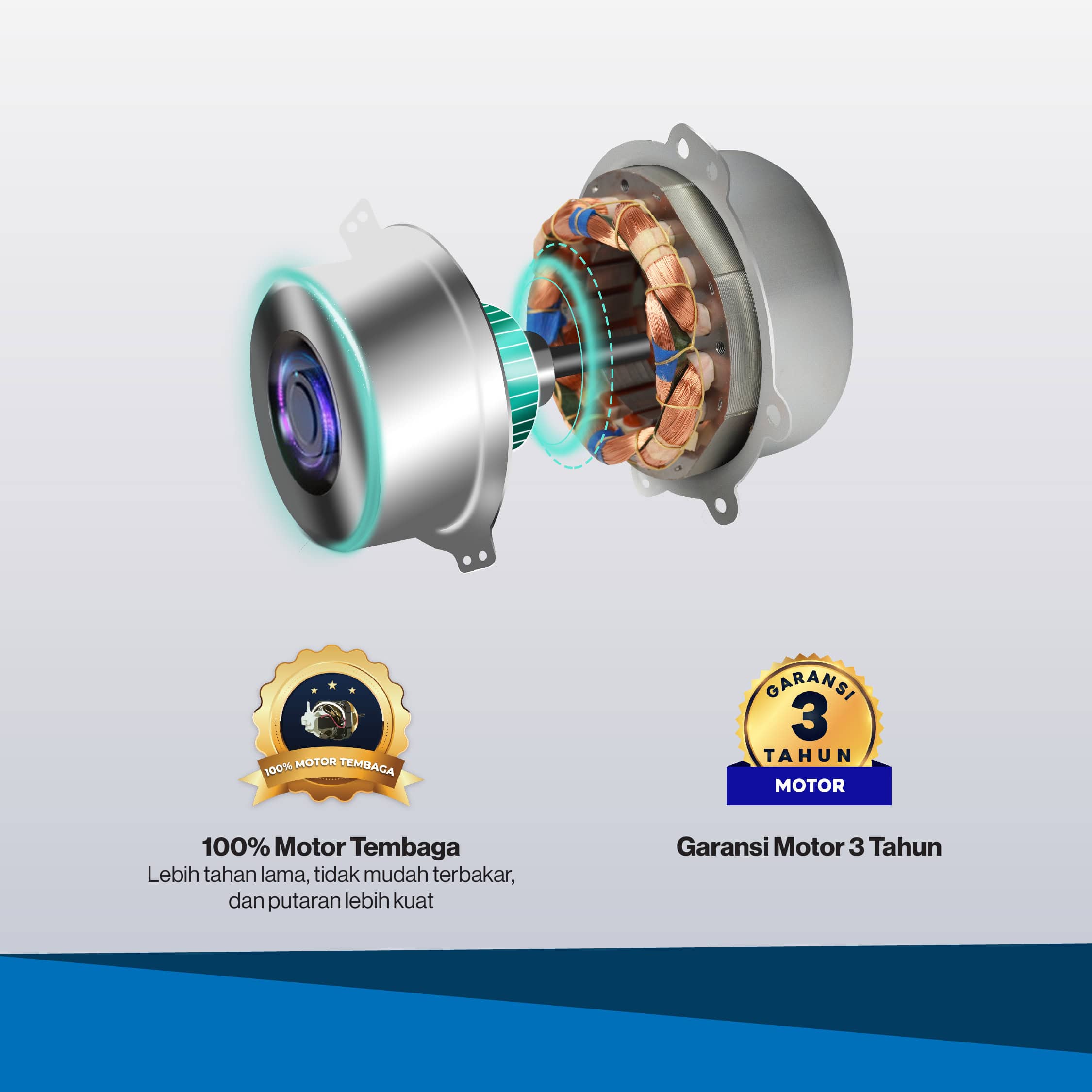 - Motor kipas terbuat dari 100% tembaga sehingga lebih tahan lama, tidak mudah terbakar, dan putarannya lebih kuat