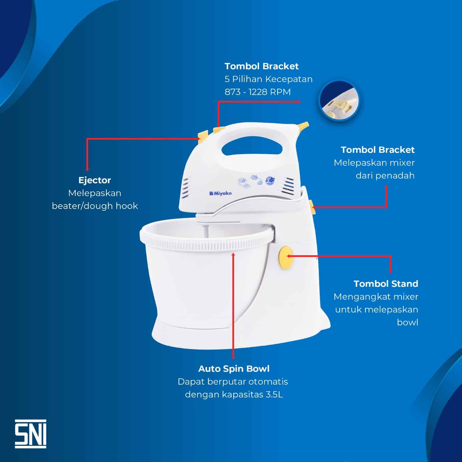 Stand mixer yang memiliki standar SNI dan sudah mendapat sertifikasi food grade yang menjadikan Anda nyaman dan aman ketika menggunakannya. Pengocok mixer yang berbahan stainless steel yang kuat, tahan lama dan mudah untuk dibersihkan. Hadir dengan fitur 5 kecepatan yang bisa Anda sesuaikan dengan kebutuhkan, handel ergonomis yang didesain khusus mengikuti genggaman tangan sehingga lebih nyaman ketika Anda gunakan.