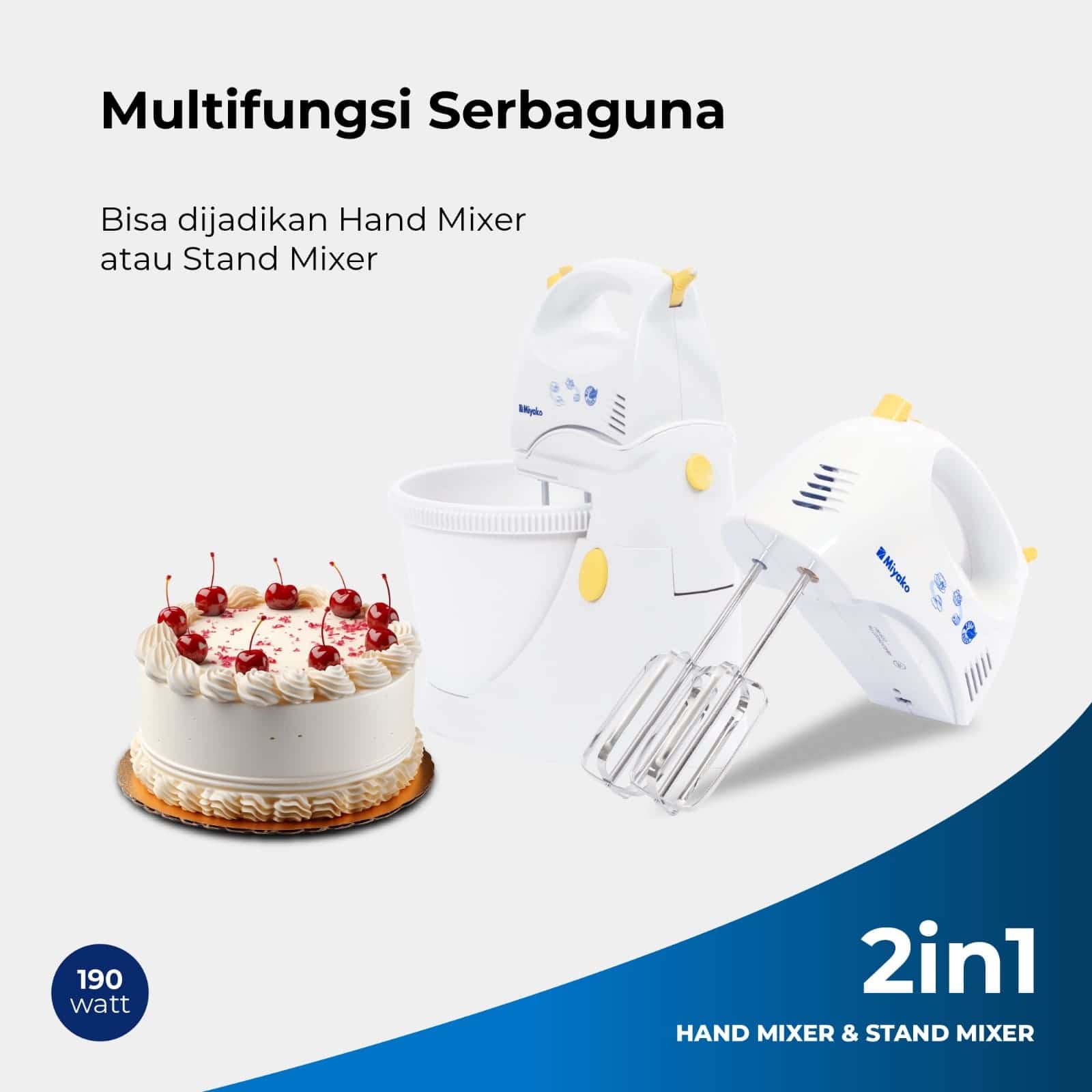 Merupakan alat pengaduk yang bisa Anda gunakan untuk mempermudah proses pencampuran makanan berjenis semi solid ataupun semi liquid, dilengkapi dengan stand mixer dan bowl (wadah pengaduk) sehingga menjadikan proses memasak ataupun membuat kue menjadi lebih mudah dan menyenangkan. Stand mixer ini memiliki tenaga 190 watt yang kuat dan hemat tenaga.