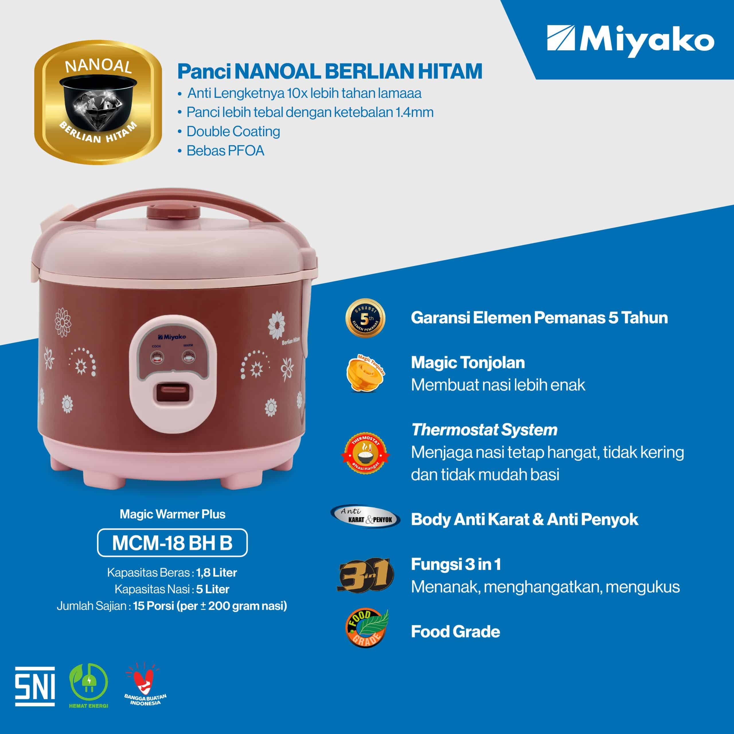 Rice Cooker Miyako MCM-18 BH B memiliki Panci Nanoal Berlian Hitam yang anti lengketnya 10x lebih tahan lama, lebih tebal dengan ketebalan 1.4 mm, serta dilapisi Double Coating pada permukaan dalam dan luar panci. Kelebihan tersebut membuat tampilan panci lebih mewah dan elegan. Panci Nanoal Berlian Hitam Miyako juga diproses dengan teknik etching. Membuat lapisan anti lengket-nya meresap ke dalam pori-pori aluminium sehingga lebih awet dan tahan lama serta memberikan permukaan yang lebih halus dan lebih mudah dibersihkan. Panci Nanoal Berlian Hitam Miyako sudah lulus uji food grade serta bersertifikasi bebas dari zat kimia asam Perfluorooctanoic (PFOA) berbahaya.