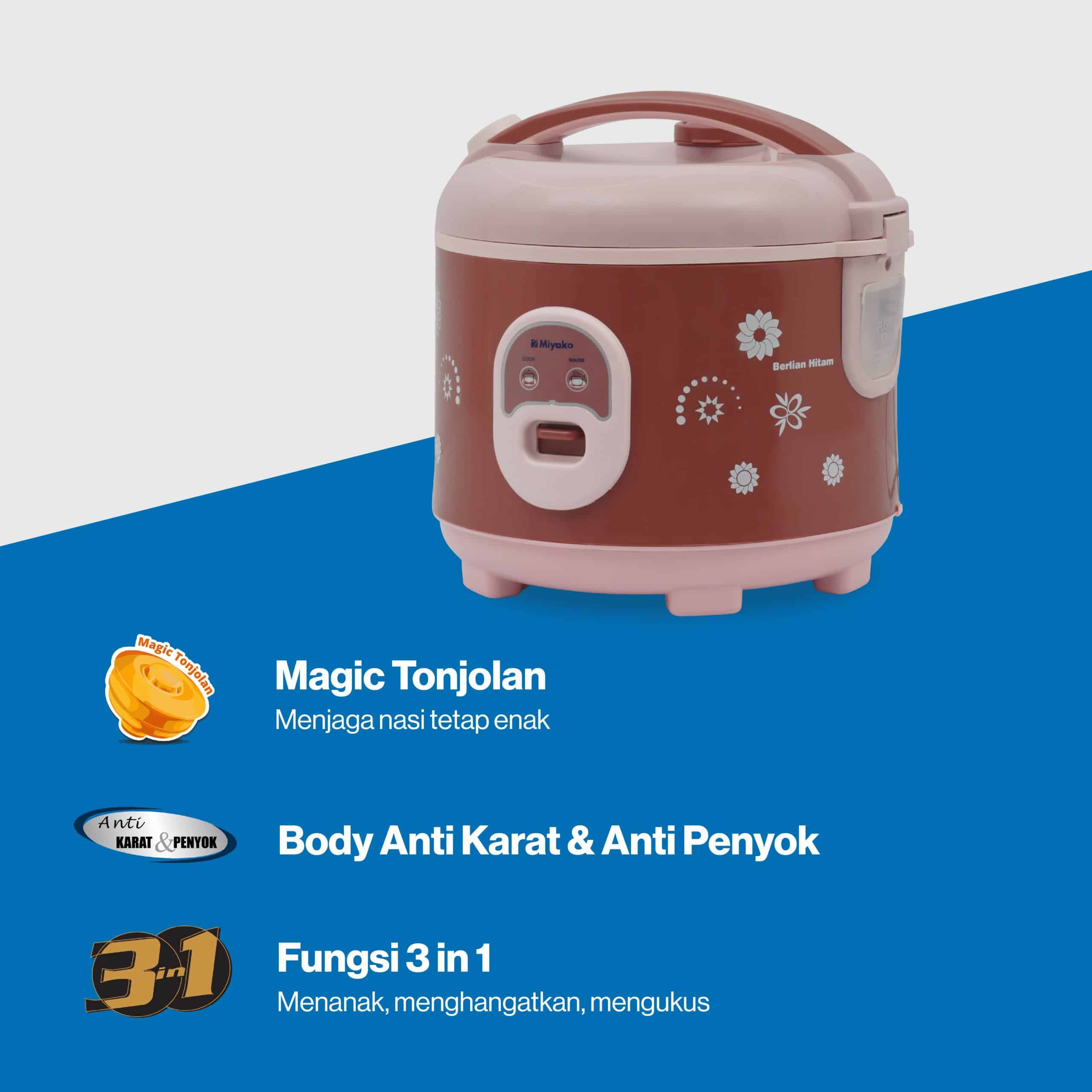 Rice Cooker Miyako MCM-18 BH B dibalut body anti karat dan anti penyok berwarna Pink Burgundy yang menawan. Selain itu, MCM-18 BH B memiliki Fungsi 3 in 1 yang sangat praktis digunakan untuk memasak dan menghangatkan sekaligus mengukus.