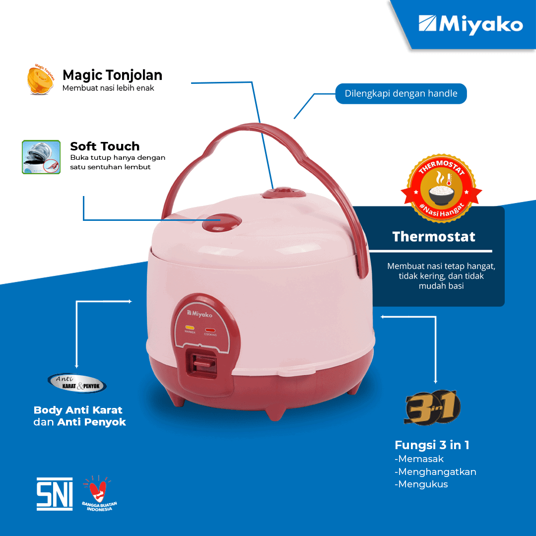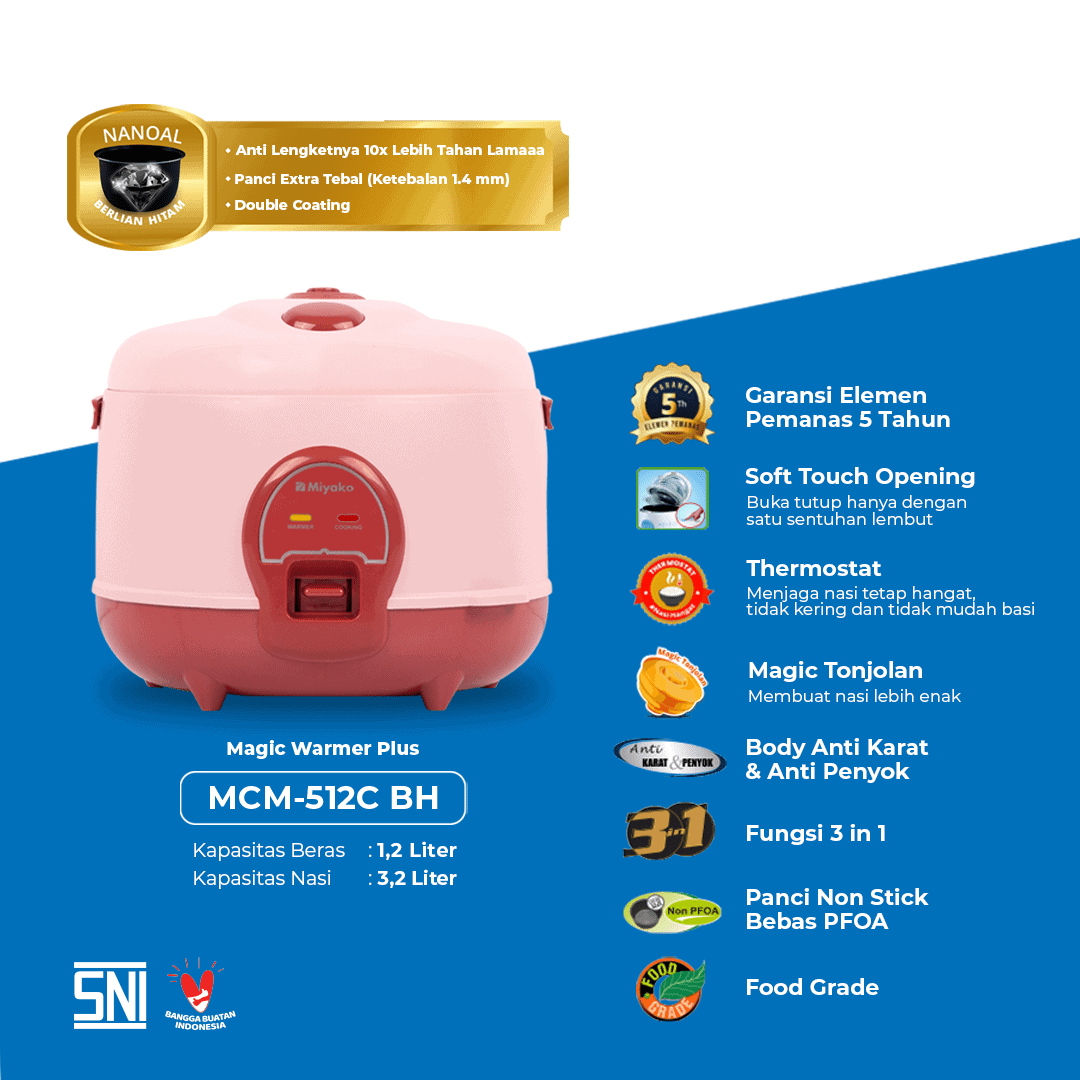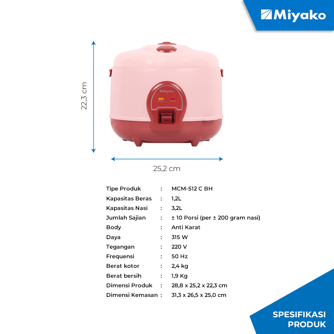 Rice Cooker Miyako MCM-512C BH dibalut body anti karat dan anti penyok berwarna Pink dengan aksen Maroon. Dilengkapi fitur Soft Touch Opening yang memiliki fungsi agar dapat memudahkan buka tutup rice cooker dengan satu sentuhan lembut. Selain itu, MCM-512C BH mempunyai kapasitas hingga 1.2 liter beras dan menghangatkan 3.2 liter nasi dengan sajian 10 porsi nasi (takaran 200 gram per porsi).