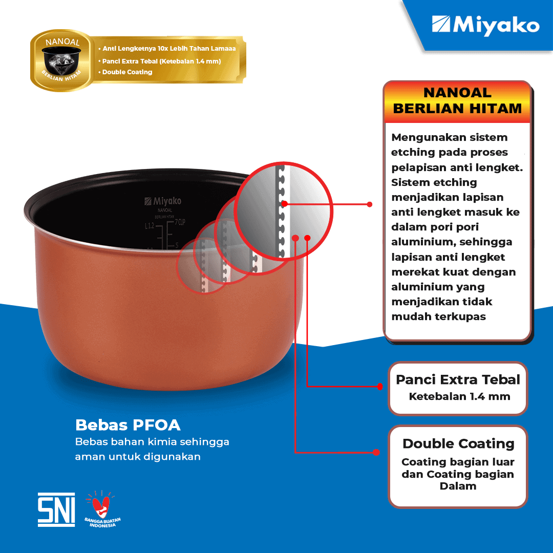 Rice Cooker Miyako MCM-512C BH memiliki Panci Nanoal Berlian Hitam yang anti lengketnya 10x lebih tahan lama, lebih tebal dengan ketebalan 1.4 mm, serta dilapisi Double Coating pada permukaan dalam dan luar panci. Menjadikan tampilan panci lebih mewah dan elegan. Panci Nanoal Berlian Hitam Miyako juga diproses dengan teknologi etching. Membuat lapisan anti lengket-nya meresap ke dalam pori-pori aluminium, menjadikan anti lengket-nya lebih awet dan tahan lama, serta memberikan permukaan yang lebih halus, dan lebih mudah dibersihkan.