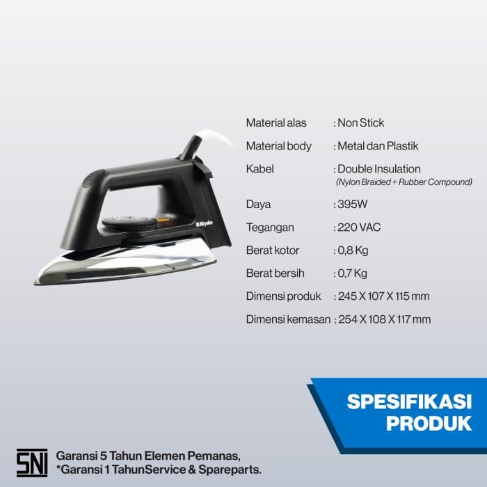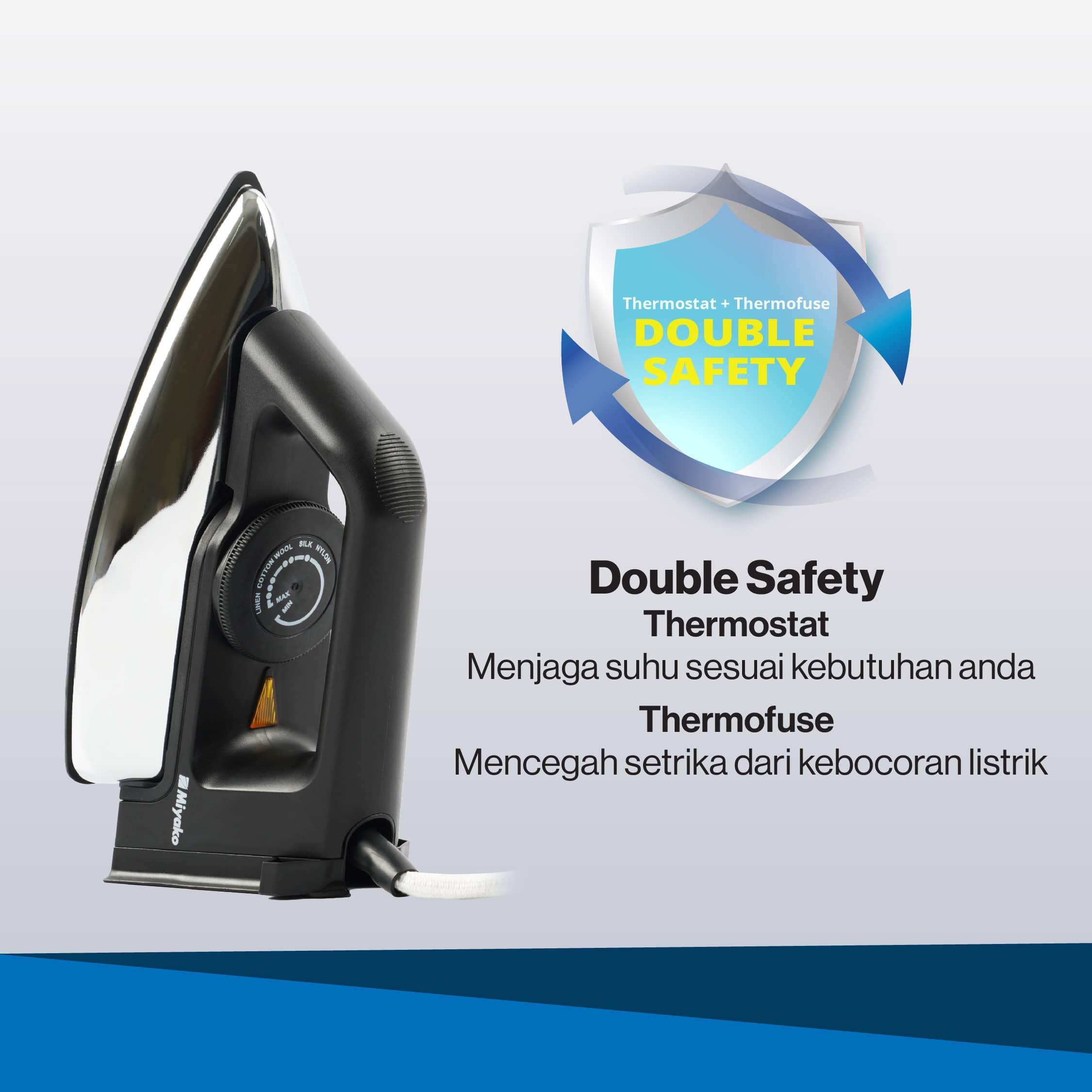 Setrika Miyako ini memiliki fitur Double Safety yang terdiri dari Thermofuse untuk menyesuaikan suhu sesuai kebutuhan dan Thermostat untuk mencegah adanya kebocoran listrik pada setrika. Setrika Miyako juga memberikan garansi 5 tahun untuk Elemen Pemanas dan telah memenuhi persyaratan lulus uji SNI