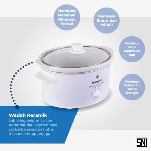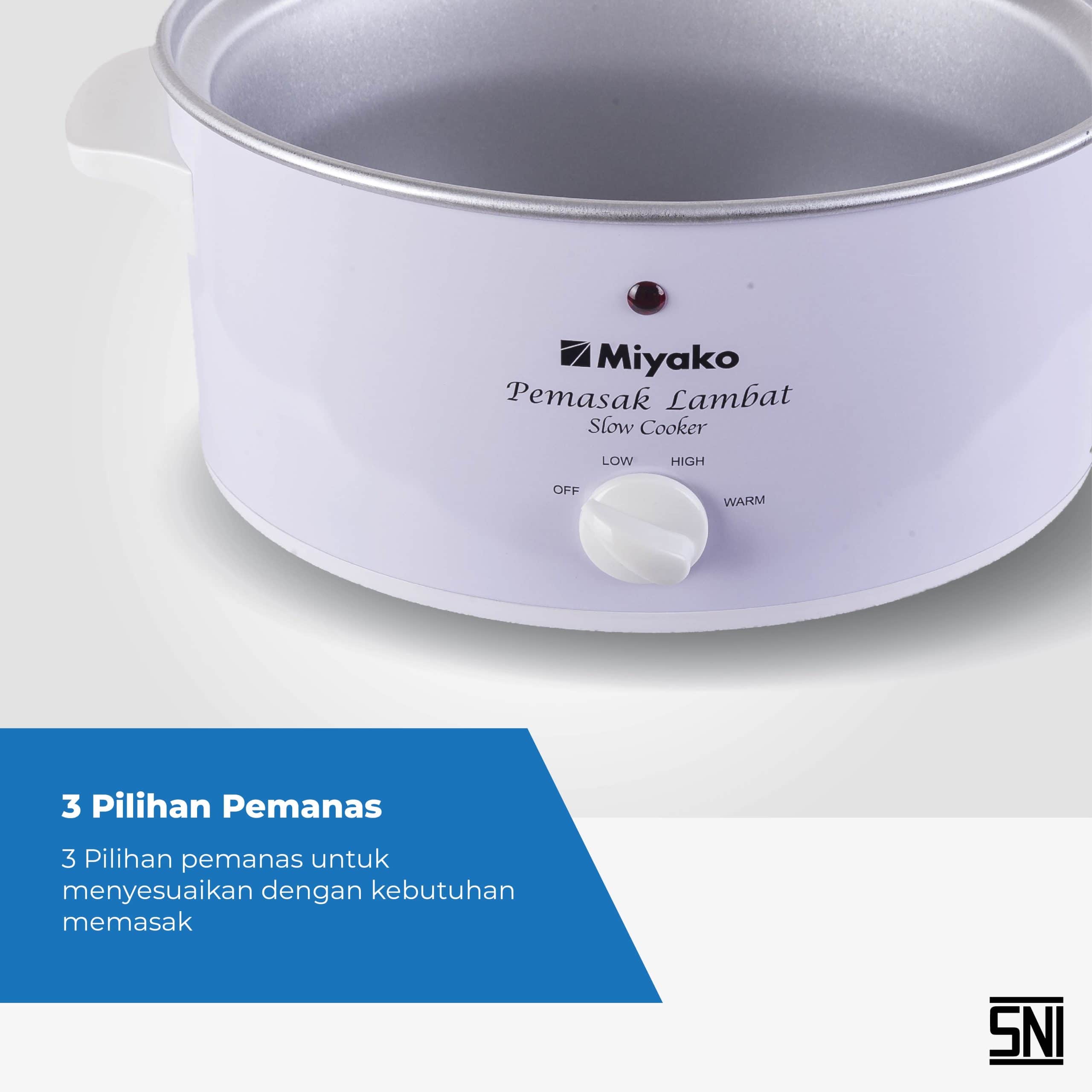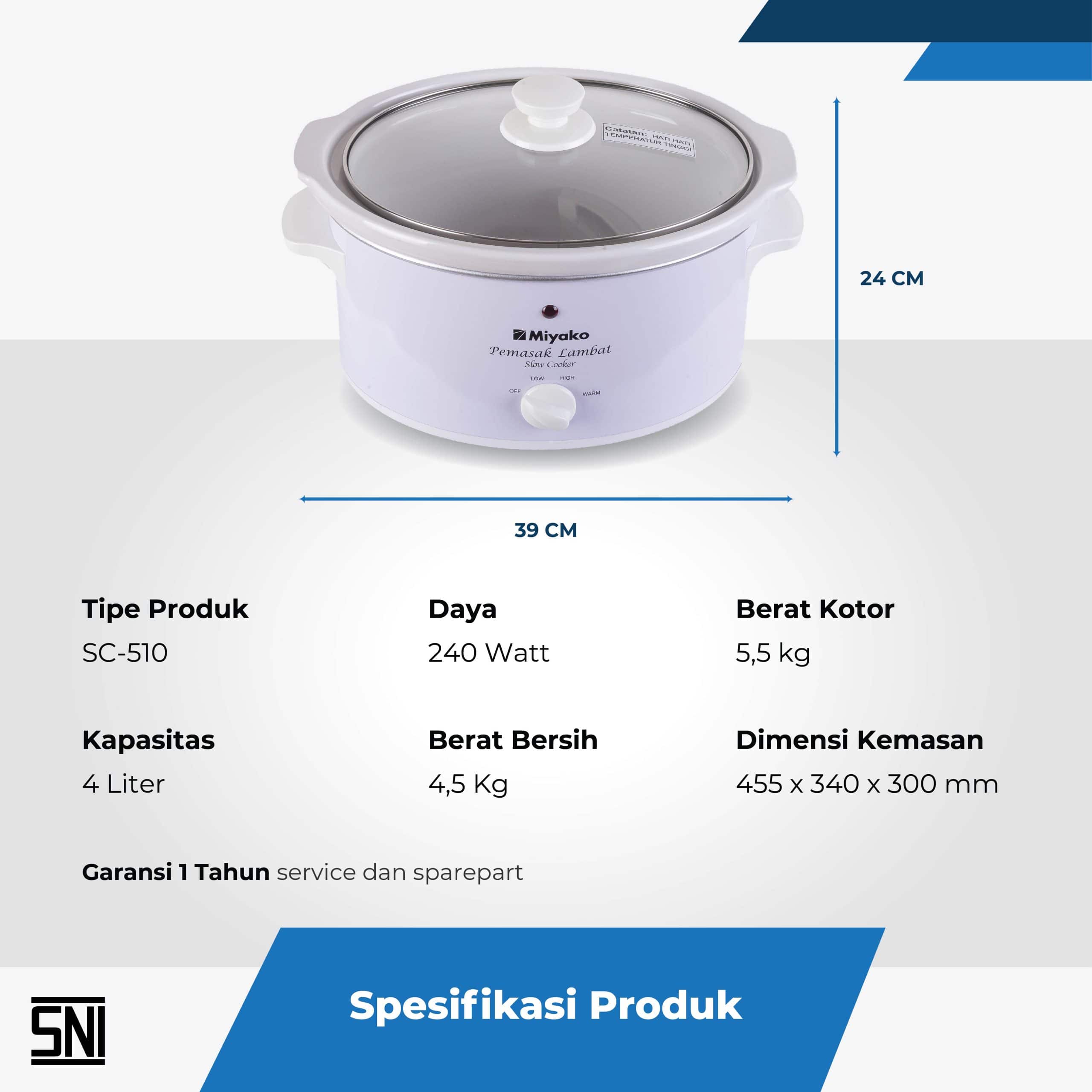 Slow Cooker Miyako SC-510 merupakan alat dapur multifungsi yang berguna untuk membuat masakan dalam waktu yang lama. Dengan kapasitas hingga 4 liter, SC-510 dapat menampung jumlah makanan yang cukup banyak. Jenis makanan yang dapat dimasak beberapa diantaranya yaitu seperti bubur, sup, Makanan Pendamping ASI (MPASI), hingga membuat daging hingga halus dan empuk. SC-510 menggunakan daya listrik sebesar 240 Watt, sehingga hemat untuk penggunaan sehari-hari.
